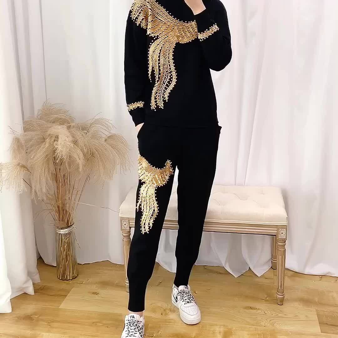 2020秋季新款女装欧洲站亮片钉珠凤凰长袖宽松针织衫休闲长裤套装